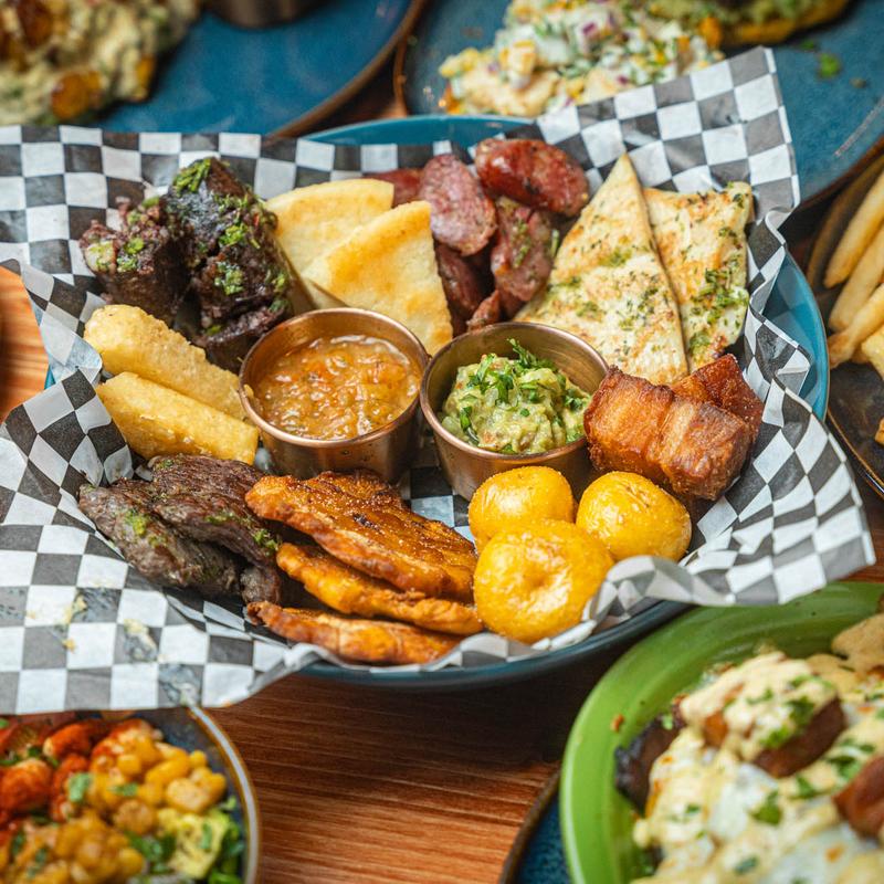 Mountain of crispy fries with Colombian sausage, sweet plantain, crispy bacon, corn, melted cheese, signature salsas, choice of meat • Extra Protein +$3.99
